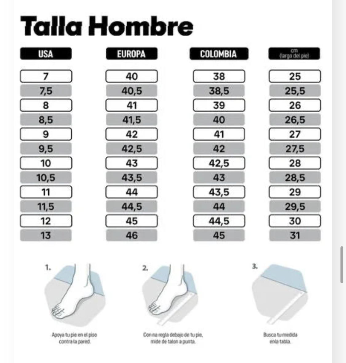 Empleamos el tallaje estándar nacional colombiano. Te aconsejamos que pidas la talla que normalmente utilizas para asegurar un ajuste adecuado.